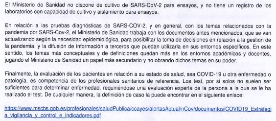 Se reconoce por parte de las autoridades sanitarias españolas que «no dispone de cultivo de SARS-CoV-2 para ensayos, y no tiene un registro de los laboratorios con capacidad de cultivo y aislamiento para ensayos» y sin embargo, SÍ sabe que existen diversas variantes. Al menos es lo que nos cuentan TODOS los medios de información «oficiales».